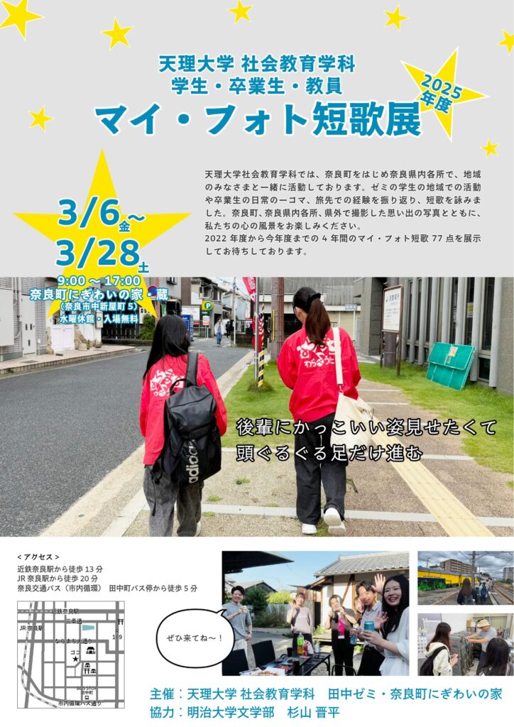 田中ゼミ(科目名:プロジェクト実習)では、奈良県内の地域で活動を行っています。その活動の最後の締めくくりとして、1年間の活動の振り返り、活動中の写真を見ながら考えたことや感じたことを言葉にして短歌を詠むマイ・フォト短歌に、学生と教員が一緒に挑戦しています。奈良町や奈良県内各所、県外で撮影した思い出の写真に私たちの心の風景を添えて作品を作り、学生・卒業生・教員合わせて5名の21作品が完成しました。3月28日(土)まで奈良町にぎわいの家(奈良市中新屋町5)で、過去の作品も含めて77作品を展示しています。圧巻の展示をどうぞご覧ください。